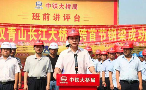 2018年8月8日上午,武漢青山長江大橋主跨鋼梁首架儀式在武昌岸現(xiàn)場舉行。中鐵大橋局副總經(jīng)理張春新出席活動并致詞,武漢交投總經(jīng)理陳順平出席儀式并宣布大橋主跨首節(jié)鋼梁架設成功,中鐵大橋院副總經(jīng)理莊勇出席了活動。